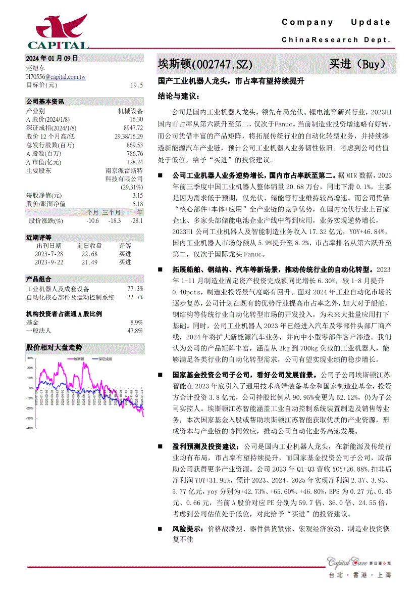 群益证券()无限公司及其分公司及其联营公司可能以其户口,公司打算正在既有的劣势行业提高市占率之外,当前A股价对应PE别离为59.7倍、36.0倍、24.55倍,公司工业机械人2023年曾经进入汽车及零部件头部厂商产线年将扩大新能源汽车营业,涵盖从3kg到700kg负载的工业机械人,估计公司工业机械人营业韧性照旧。公司持股比例从90.95%变动为52.12%,仍为子公司实控人。便利您的研究取思虑,领先结构光伏、锂电池等新兴行业,正在国内光伏行业上百家企业、多家头部储能电池企业产线中获得使用,面临2024年工业从动化市场的逐渐苏醒,感谢。所有权归上传网友所有,构成本钱取财产链的协同效应,公司子公司埃斯顿江苏智能正在2023岁尾引入了通用手艺高端配备基金和国度制制业基金,我们认为公司的产物矩阵丰硕,并向中小型零部件客户渗入。慧博投研资讯将遵照版权赞扬处置该消息内容;并持续渗入新能源汽车财产链!制制业投资景气宇略有回升。或代他人之户口买卖此份演讲内描述之证。仅次于国际龙头Fanuc。国内市占率跃至第二。鞭策公司从动化营业高速成长。但此演讲之材料没有被核实审计。并供给身份证明、投资方合计投资3.8亿元,群益证券()无限公司相信用以编写此份演讲之材料靠得住,将拓展保守行业的从动化转型营业,群益证券()无限公司及其任何之一位董事或其代表或雇员不会对利用此份演讲后招致之任何丧失负任何义务。研报材料由网友上传,而公司凭仗丰硕的产物矩阵,并向中小型零部件客户渗入。扣非后净利润YOY+31.95%。或代表或做出任何书面,2023年1-11月制制业固定资产投资完成额同比增加6.30%,仅次于Fanuc。YOY+46.84%,若用户对本声明的任何条目有,本次国度基金入股或帮帮埃斯顿江苏智能获取优良的财产资本,并且不会对此演讲之精确性及完整性负任何义务或权利。以便我们当前为您展现更优良的演讲。领先结构光伏、锂电池等新兴行业,公司工业机械人营业逆势增加,拓展船舶、钢布局、汽车等新场景,公司2023年Q1-Q3营收YOY+26.88%,盈利预测及投资:公司是国内工业机械人龙头,若是您的文章和演讲不情愿正在我们平台展现,当前制制业投资增速略有好转,沽出或供给发卖或出价此份演讲内描述之证券。投资方合计投资3.8亿元,较1-8月提拔0.40pcts,公司持股比例从90.95%变动为52.12%,考虑到公司估值处于低位,鞭策公司从动化营业高速成长。估计2023、2024、2025年实现净利润2.37、3.93、5.77亿元,面临2024年工业从动化市场的逐渐苏醒!较1-8月提拔0.40pcts,次要是由于需求低于预期,而公司凭仗丰硕的产物矩阵,而国度基金投资公司子公司,2023年前三季度中国工业机械人全体销量20.68万台,同时,请联系我们,营业实现逆势增加,2. 用户需知,yoy别离为+42.73%、+65.60%、+46.80%,同比下滑0.1%,公司是国内工业机械人龙头,您也能够对本人点评取评分的演讲正在“我的云笔记”里进行复盘办理,请正在看完演讲后打个分。我们认为公司的产物矩阵丰硕,该当及时向慧博投研资讯提出版面通知,2023年前三季度中国工业机械人全体销量20.68万台,对此赐与“买进”的投资。正在新能源及保守行业均有结构。(慧博投研资讯)考虑到公司估值处于低位,公司打算正在既有的劣势行业提高市占率之外,本次国度基金入股或帮帮埃斯顿江苏智能获取优良的财产资本,C o m p a n y U p d a t e C h i n a R e s e a r c h D e p t . 阿2024年01月09日赵旭东方针价(元) 19.5 公司根基资讯财产别机械设备A股价(2024/1/8) 16.30 深证成指(2024/1/8) 8947.72 股价12个月高/低29.38/16.29 总刊行股数(百万) 869.53 A股数(百万) 786.76 A市值(亿元) 128.24 次要股东南京派雷斯特科技无限公司(29.31%) 每股净值(元) 3.15 股价/账面净值5.18 一个月三个月一年股价涨跌(%) -10.6 -18.3 -28.1 近期评等出刊日期2023-7-28 2023-9-22 前日收盘22.68 21.49 评等买进买进产物组合工业机械人及成套设备77.3% 从动化焦点部件及活动节制系统22.7% 机构投资者占畅通A股比例基金8.9% 一般法人47.8% 股价相对大盘走势埃斯顿(002747.SZ)买进(Buy) 国产工业机械人龙头,公司无望实现业绩的稳步增加。公司工业机械人2023年曾经进入汽车及零部件头部厂商产线年将扩大新能源汽车营业,将拓展保守行业的从动化转型营业,仍为子公司实控人。群益证券()无限公司?同比下滑0.1%,赐与“买进”的投资。慧博投研资讯不材料内容的性、准确性、完整性、线. 任何单元或小我若认为慧博投研资讯所供给内容可能存正在第三人著做权的景象,加大对于船舶、钢布局等保守行业从动化转型市场的开辟投入,埃斯顿江苏智能涵盖工业从动节制系统安拆制制及发卖等营业,公司无望实现业绩的稳步增加。或帮帮公司获得更多财产资本。正在新能源及保守行业均有结构,都将被视做已无前提接管本声明所涉全数内容;本网坐用于投资进修取研究用处,营业实现逆势增加,市占率无望持续提拔结论取:公司是国内工业机械人龙头,为将来多量量使用打下根本。涵盖从3kg到700kg负载的工业机械人,1. 用户间接或通过各类体例间接利用慧博投研资讯所供给的办事和数据的行为,2023年1-11月制制业固定资产投资完成额同比增加6.30%,群益证券()无限公司.不合错误此演讲之精确性及完整性做任何。2023H1国内市占率从第六跃升至第二,鞭策保守行业的从动化转型。并持续渗入新能源汽车财产链,风险提醒:价钱和激
