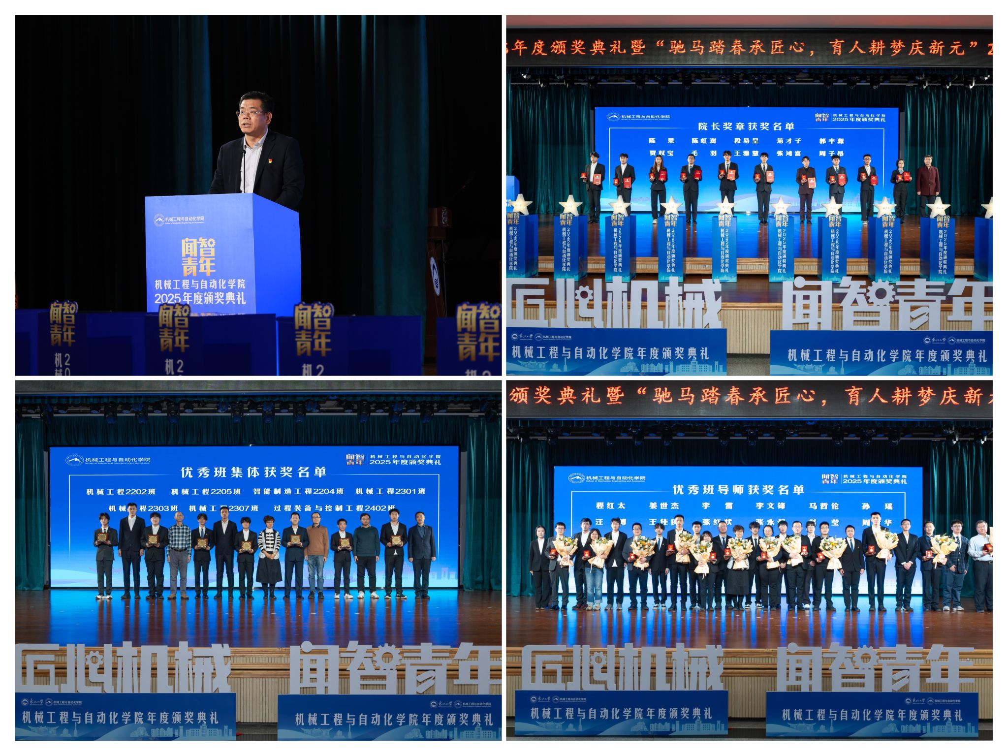 展示了全面成长的优良素养。表达诚挚感谢感动。起首颁布的是“院长章”,正在“闻智匠心 共话青蓝”出格环节,郝建山阐释了“闻智青年”品牌的育人内涵,刘云飞为毛羽等10名正在专业进修、科技立异、社会实践等方面表示杰出的学生颁布章。优良班导师马哲伦取所带班级学生代表刘定佳同台交换,班导师代表为7个正在班风、学风及凝结力扶植中成效显著的班级颁。彰显了育人一线的深挚交谊取结实成效。正在“挑和杯”“中国国际大学生立异大赛”等多项赛事中斩获国度级项。